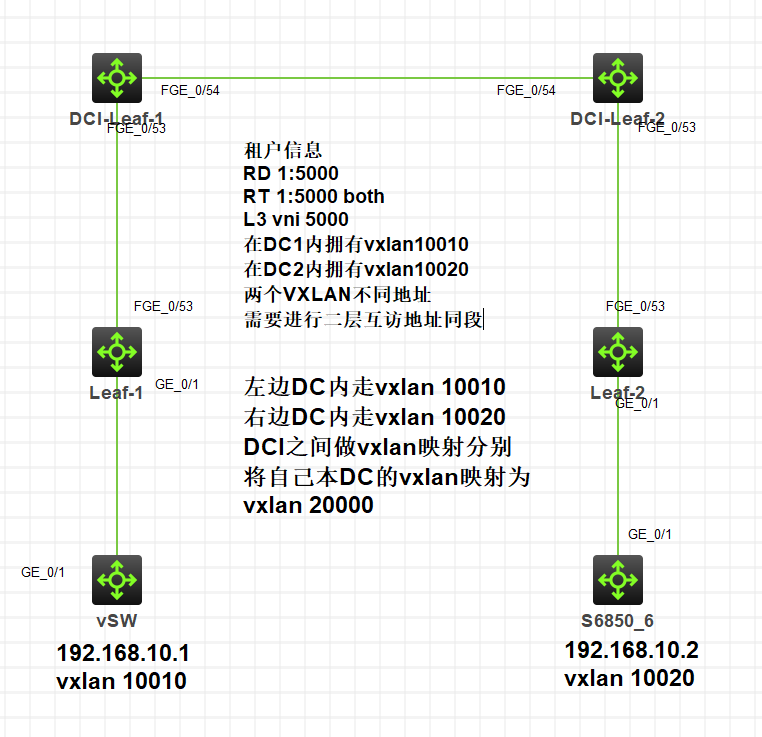 场景说明:同一个租户在两个DC之间分别租了机器,为了满足虚拟机漂移、二层互访的场景,地址设计上在同一个网段,因此需要不同DC之间进行同租户的二层互访。