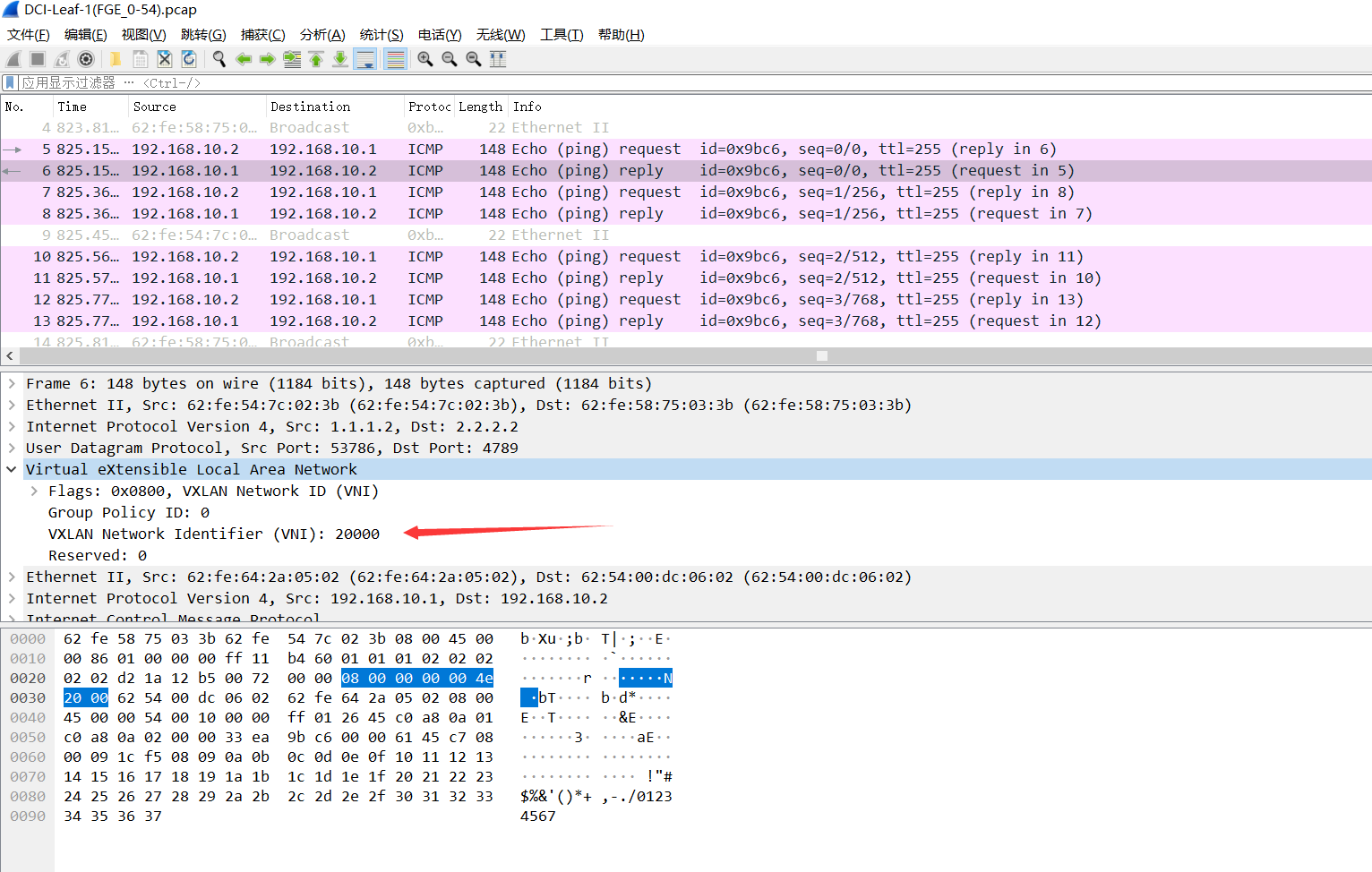 由此可见,中间DCI之间传输报文的时候,是封装vlxan2000的,原始数据报文中的源目地址不变。适用于H3C VXLAN DCI互联配置